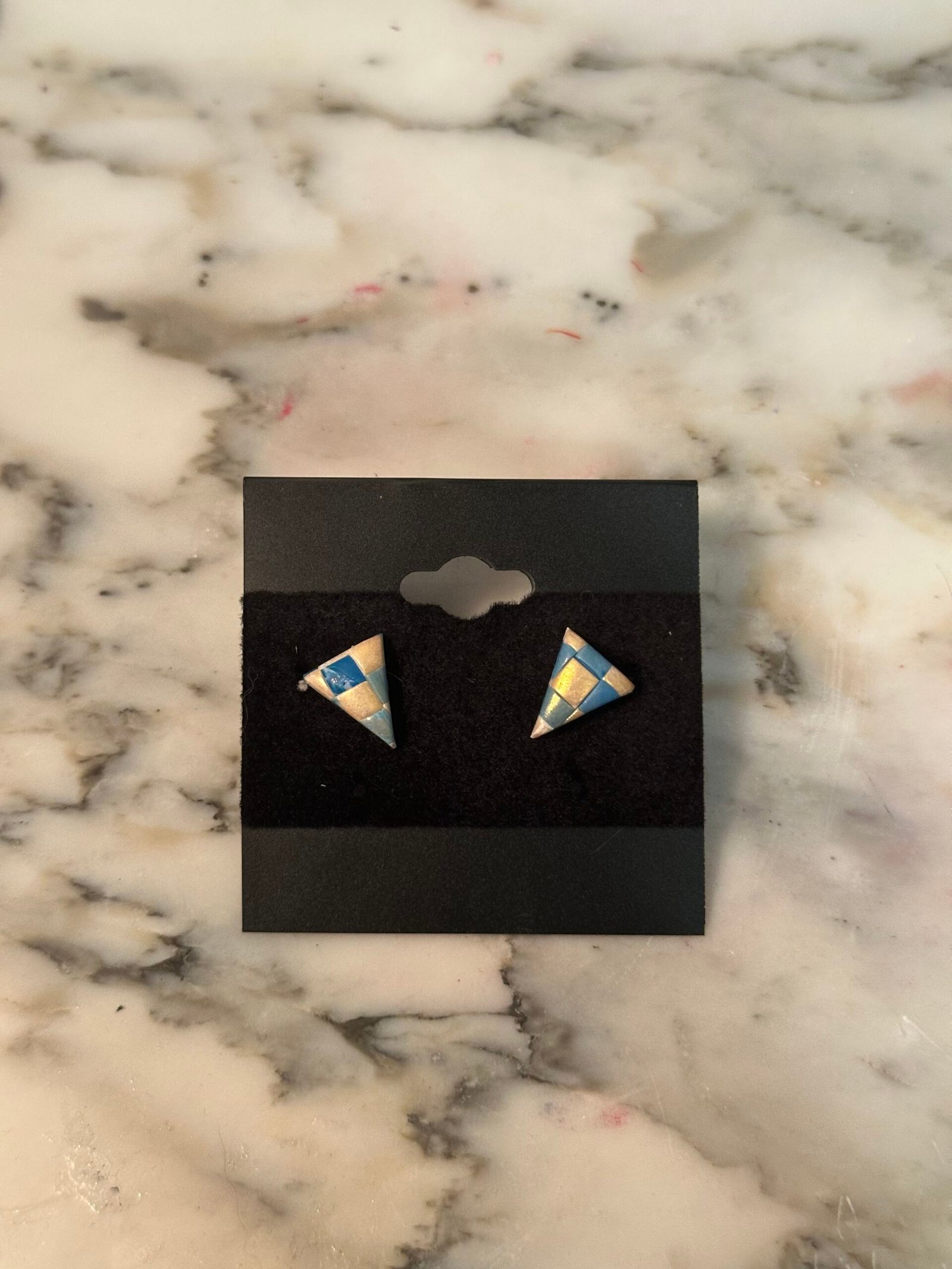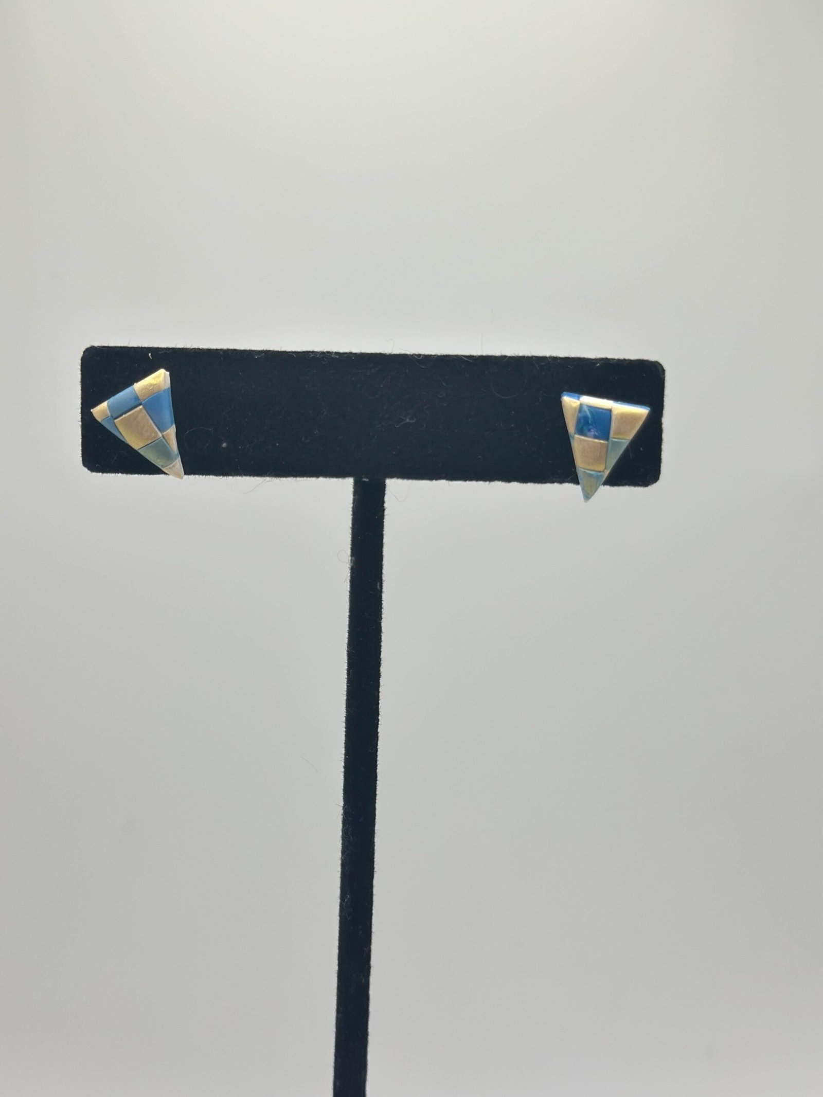 Small triangular studs with a blue and pale gold checkerboard pattern
