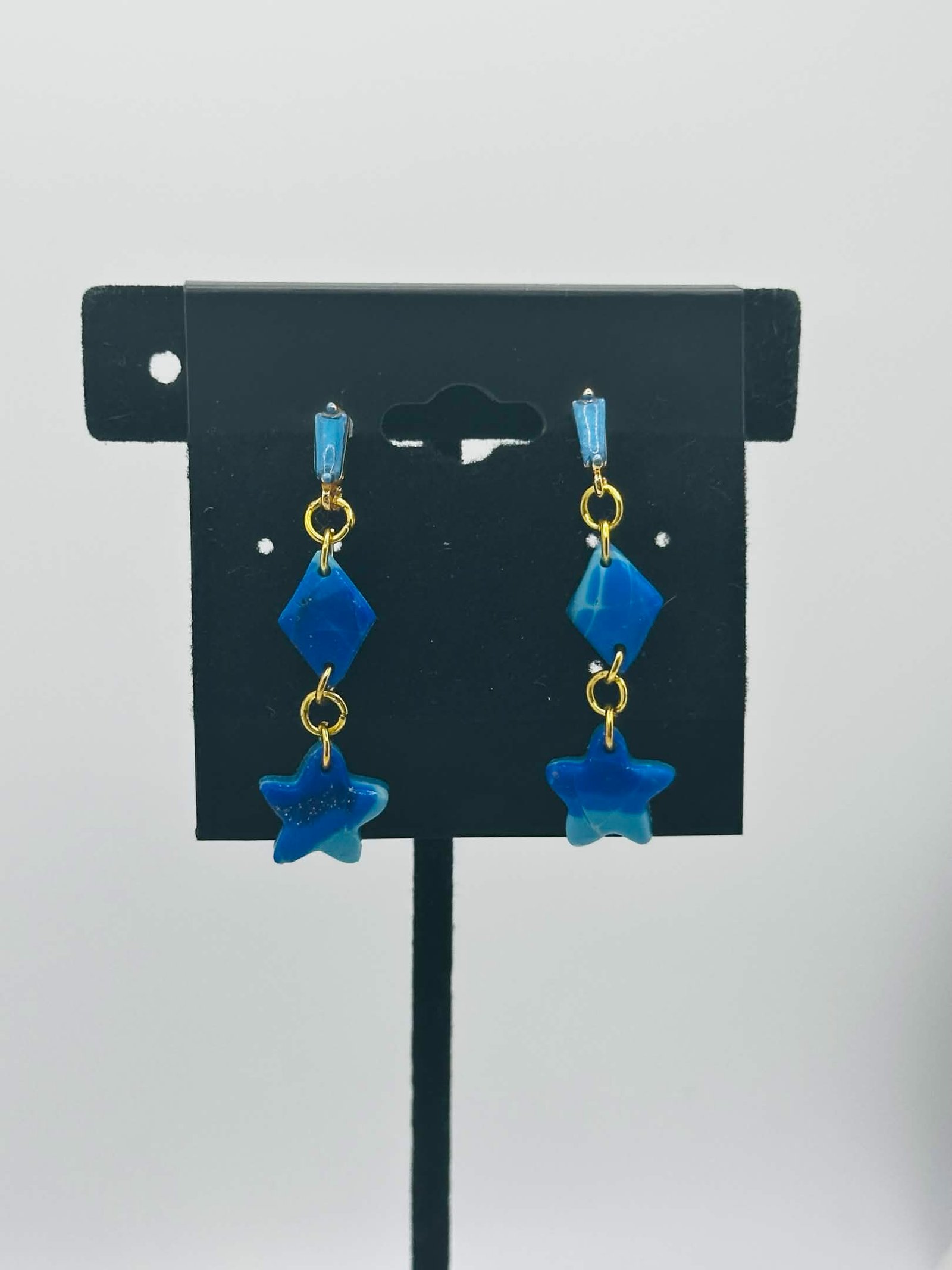 Delicate marbled blue star-and-diamond drop earrings mounted below a blue gemstone stud framed in gold.