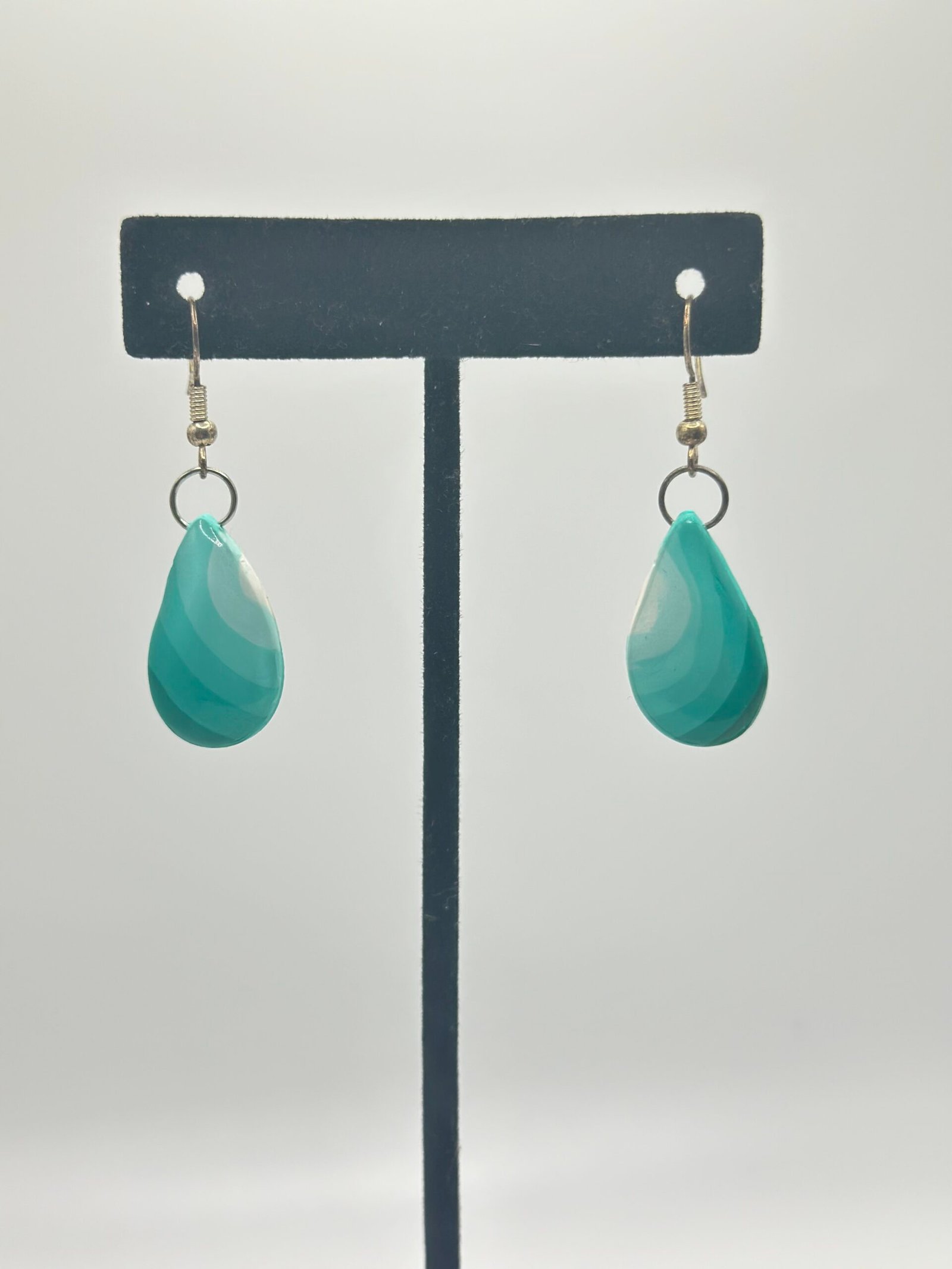 Lightweight, dilution-striped teal to white clay earrings with each dilution curved into concentric rings. The teardrop shape is simple and well-established, with a coat of resin gloss to improve appearance, durability, and tactile experience.