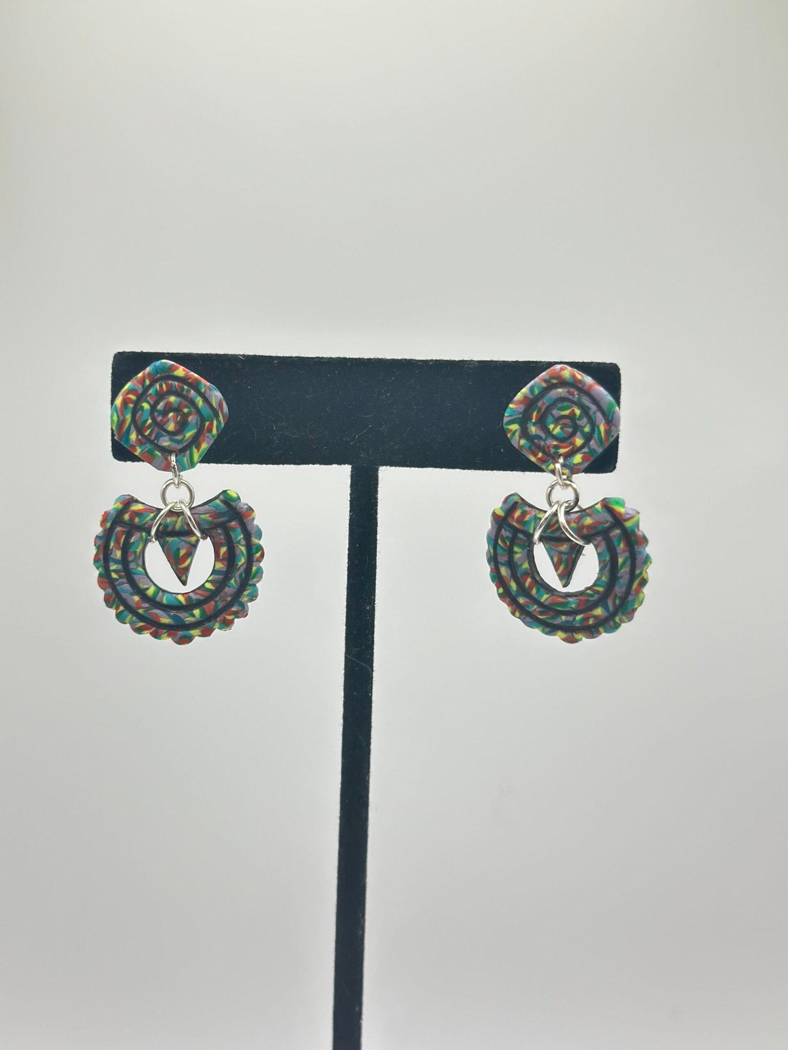 Spiraling stud-mounted small earrings made up of finely colorful confetti patterns and black-lined details.