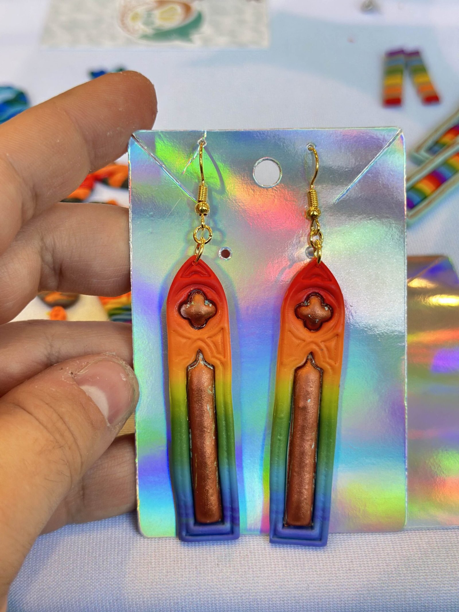 Tall grand windows, the frames made up of a full smooth rainbow gradient and the central windows made up of a bold copper.