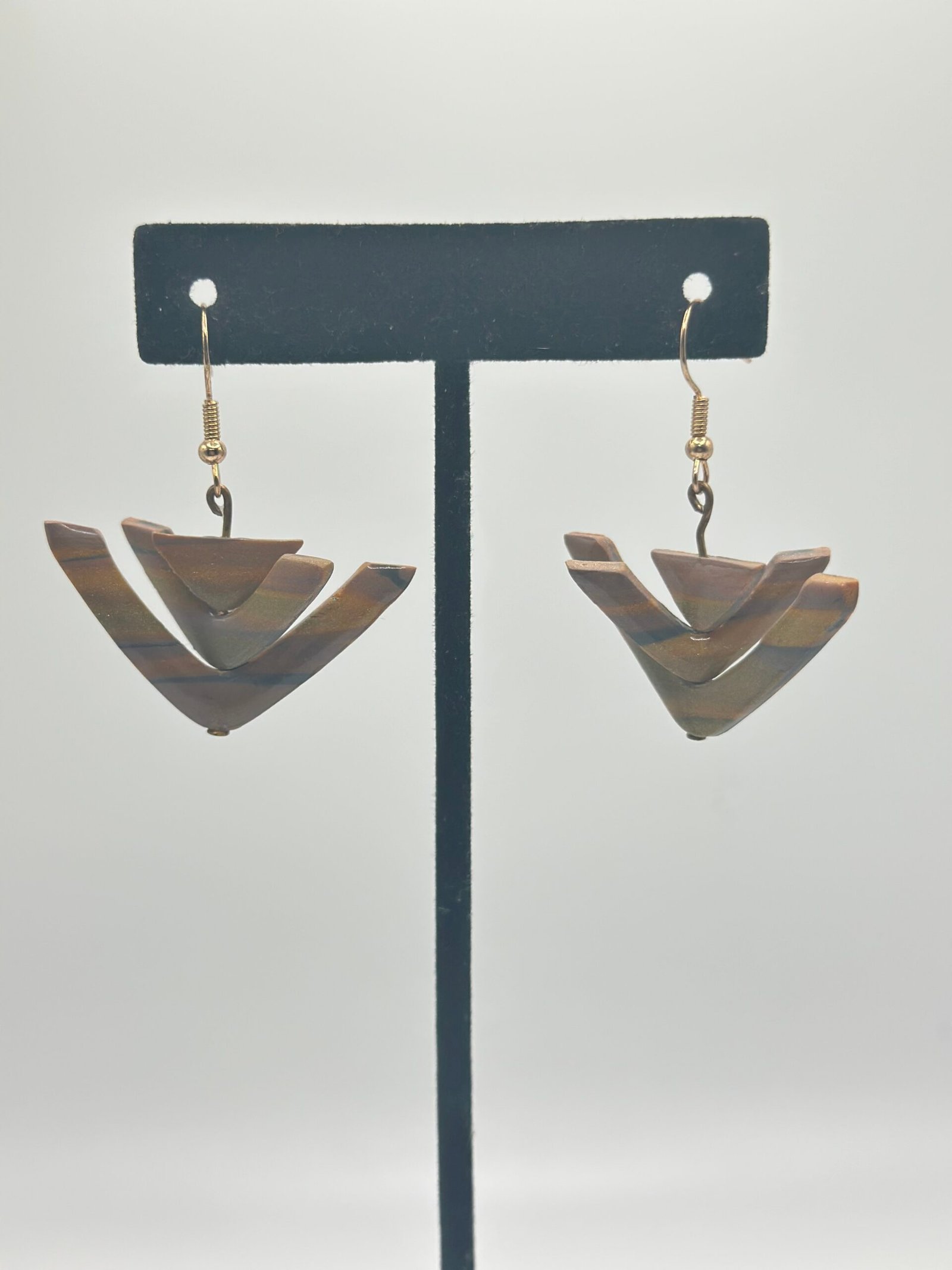 Glossy brown and bronze earrings composed of three interlocking chevrons, all spun at different angles to evoke the imagery of spinning disks.