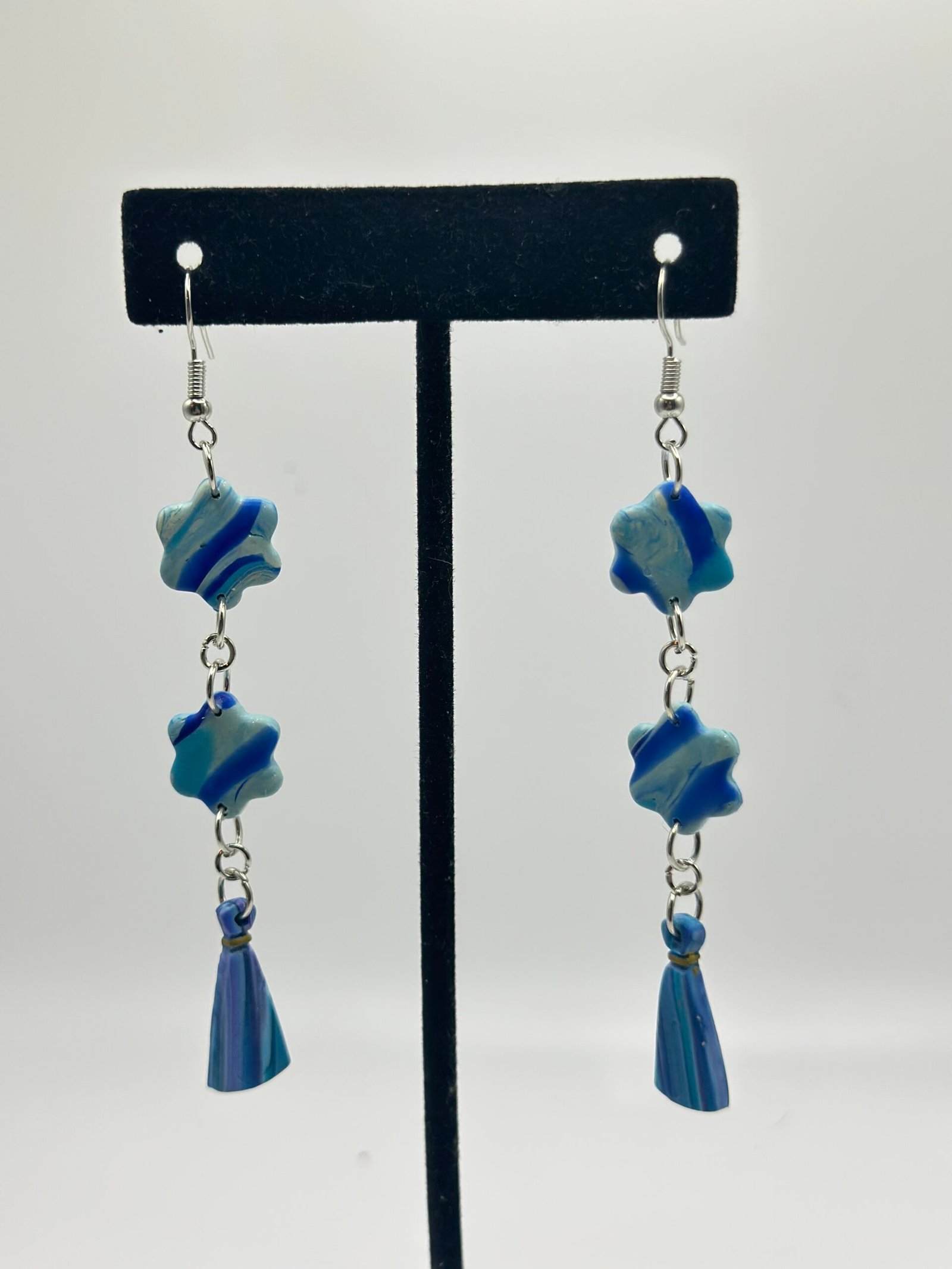 Dangle earrings with pairs of marbled blue flowers mounted above darker blue clay tassels.