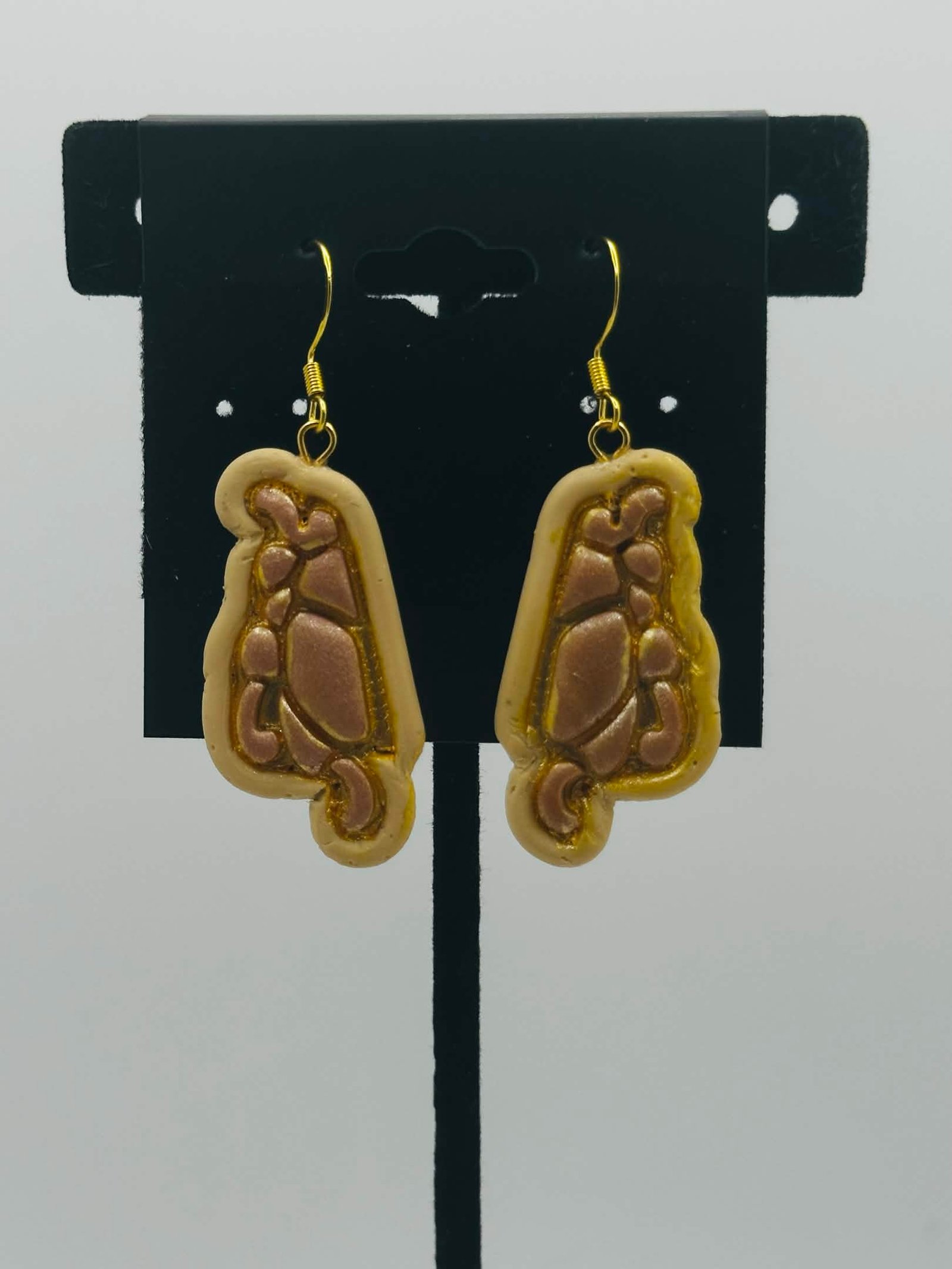 Mirrored dangles, each with half of a copper scarab framed by a sandy yellow border.