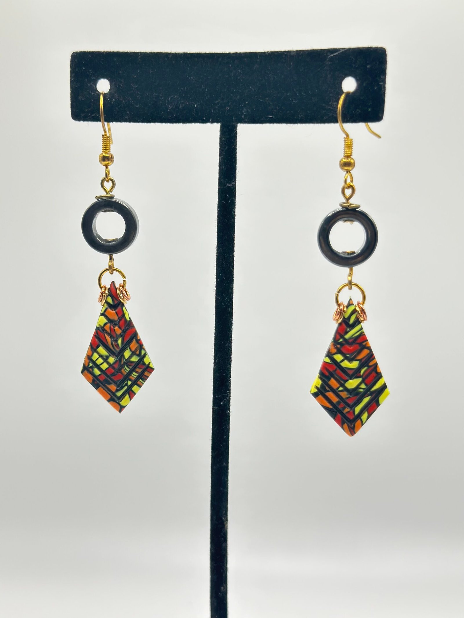 Striped, ridged kite-shaped warm-toned stained glass charms mounted on circular enamel rings. These earrings sport a matte gloss and subtle chain accents.