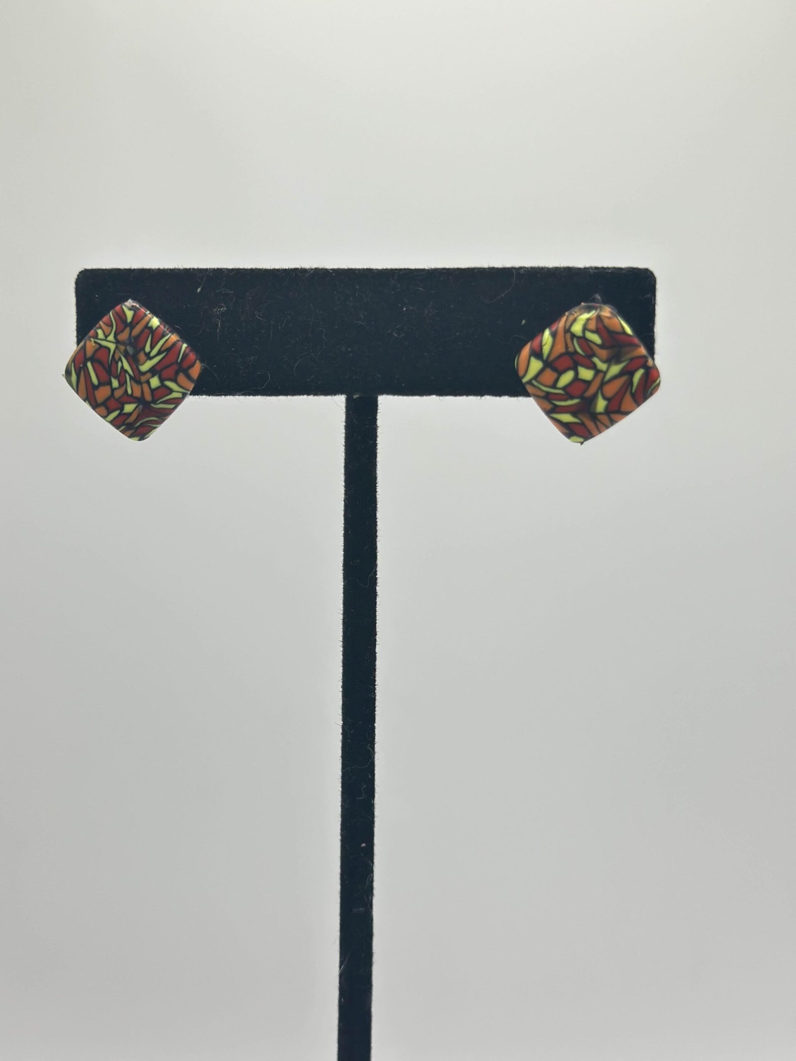 Square studs made up of a warm-toned color blocked pattern of small, sharp diamond shapes.