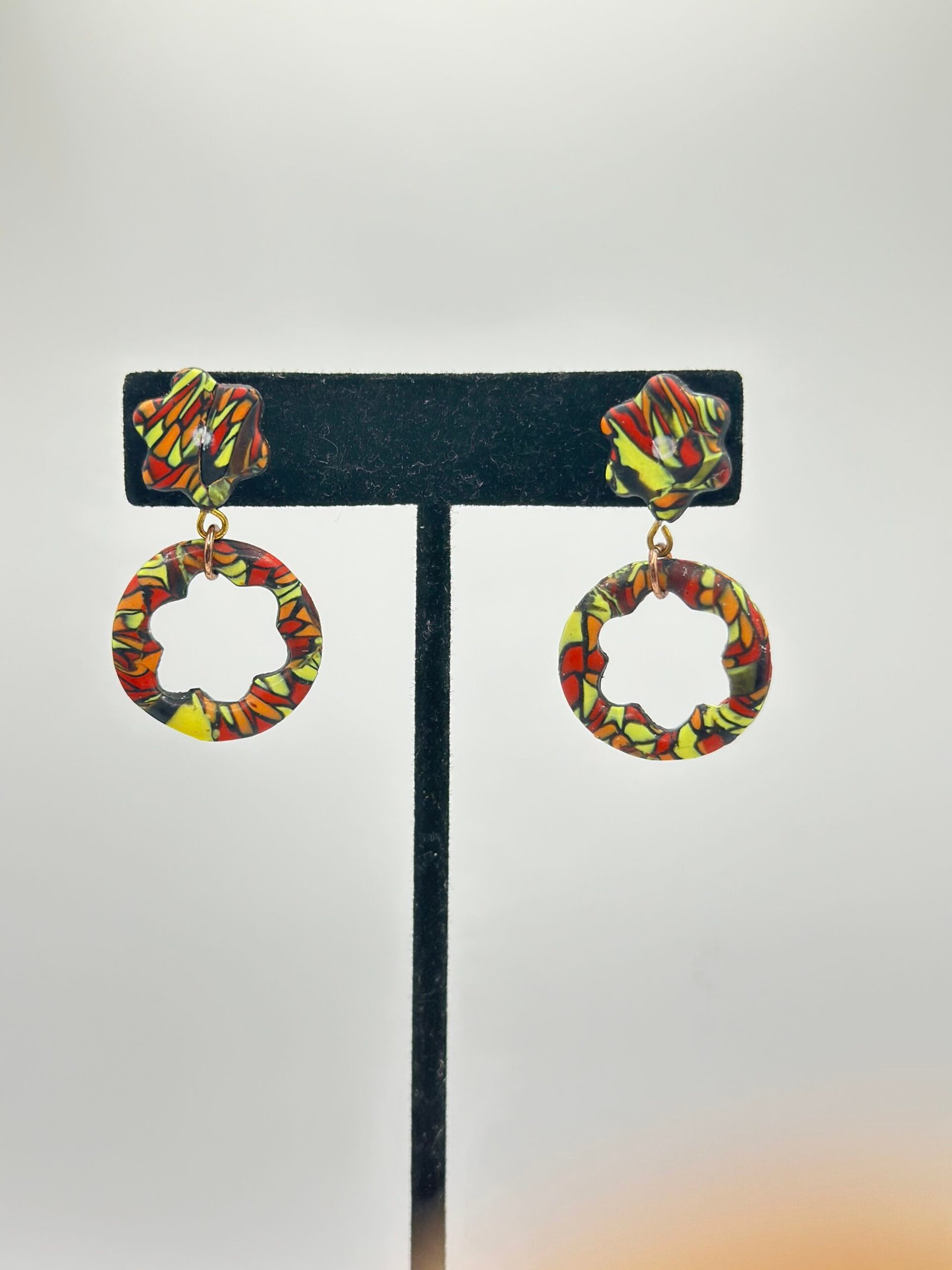 Circles with a flower-shaped cutout dangled beneath the cutout flower as a stud, all patterned with warm-toned stained glass.