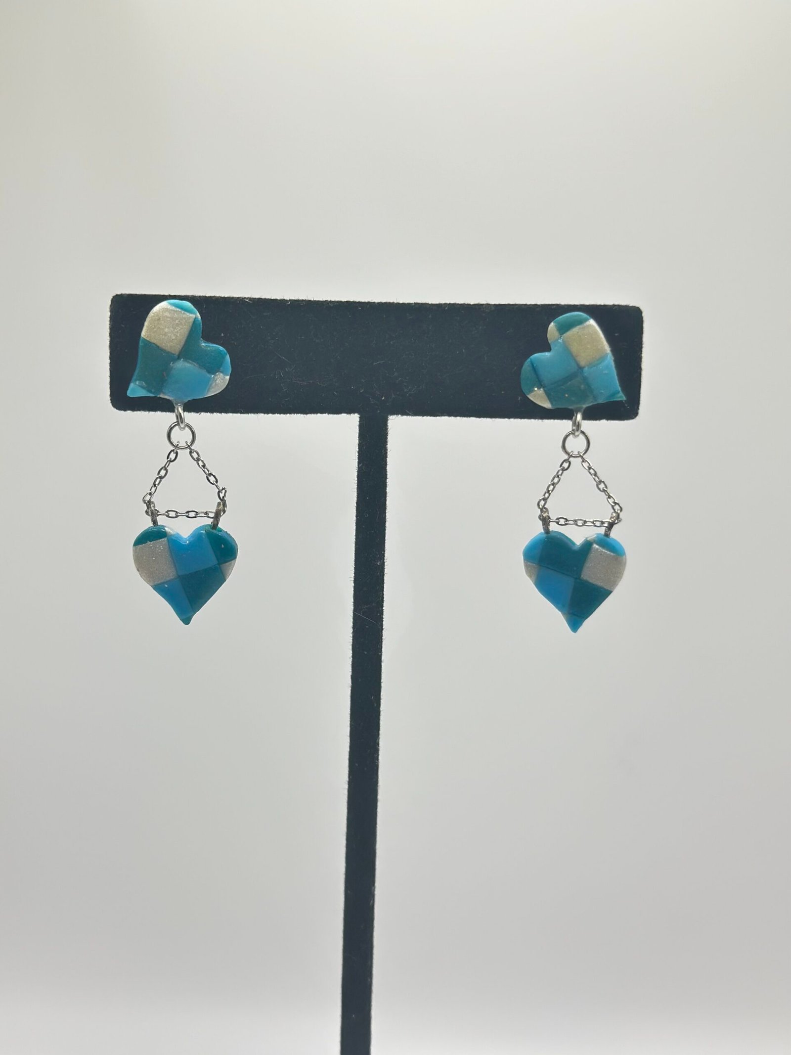 Blue-and-white checkered hearts mounted on studs and dangling additional heart charms below them with a triangle-shaped chain loop.