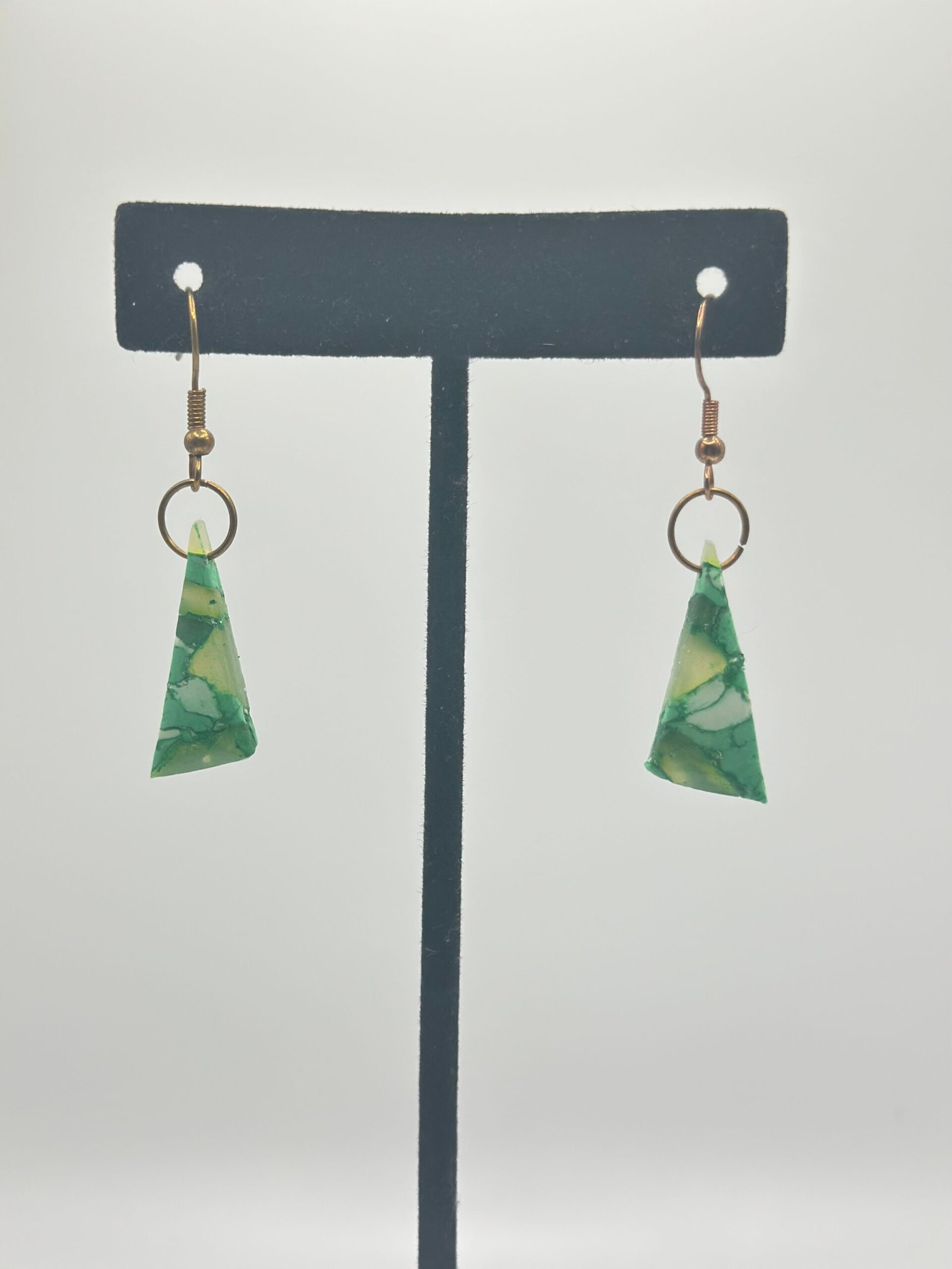 Simple glossed wedge-shaped earrings designed to show off an intricate green-and-white marble pattern.