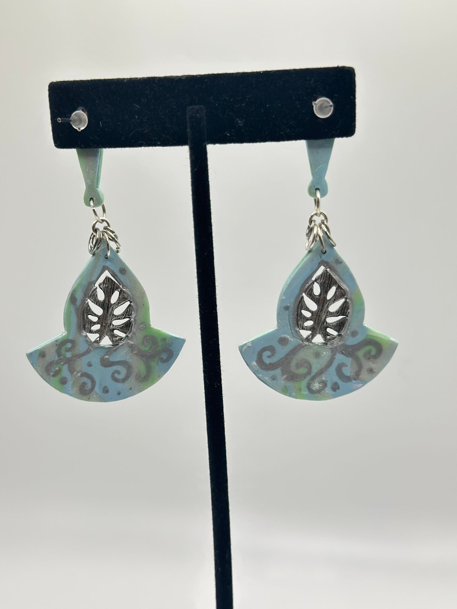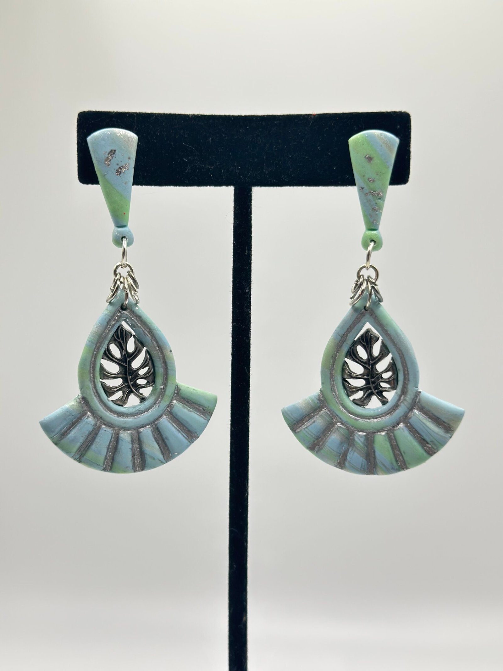 Macrame-like teal arcs with a teardrop window that leads to a steel monstera leaf. Mounted on wedge-shaped, silver-leaf-adorned studs.