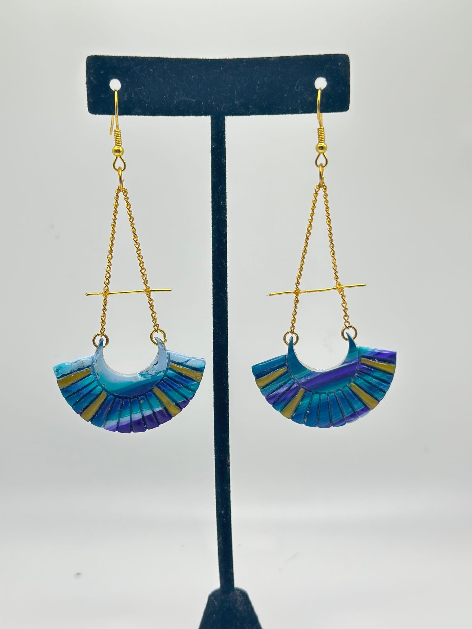 Wide ribbed fans in a blue and purple, oceanic pattern, accented by gold stripes and mounted on gold chain and findings.