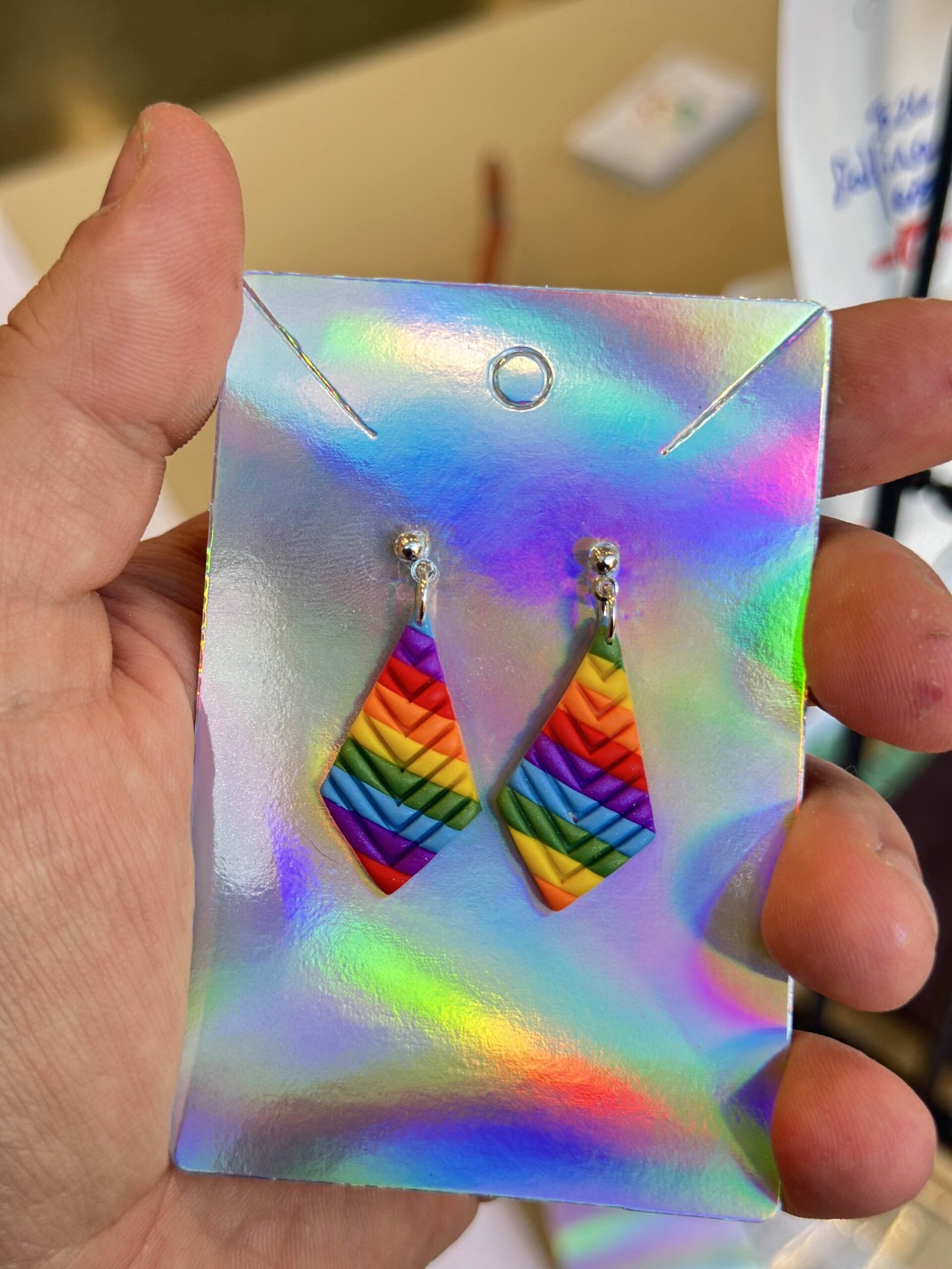 Ridged kite shapes made up of rainbow stripes. Mounted on small silver ball studs.