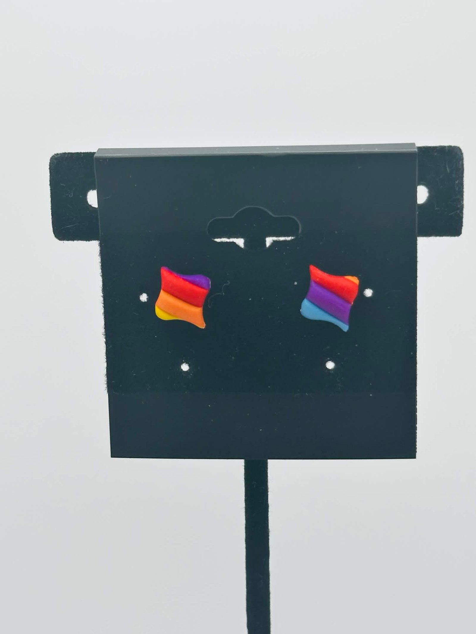 Small curved diamond studs made of rounded stripes of colors. Asymmetric; one diamond has purple, red, orange, and yellow stripes, and the other has orange, red, purple, and blue.