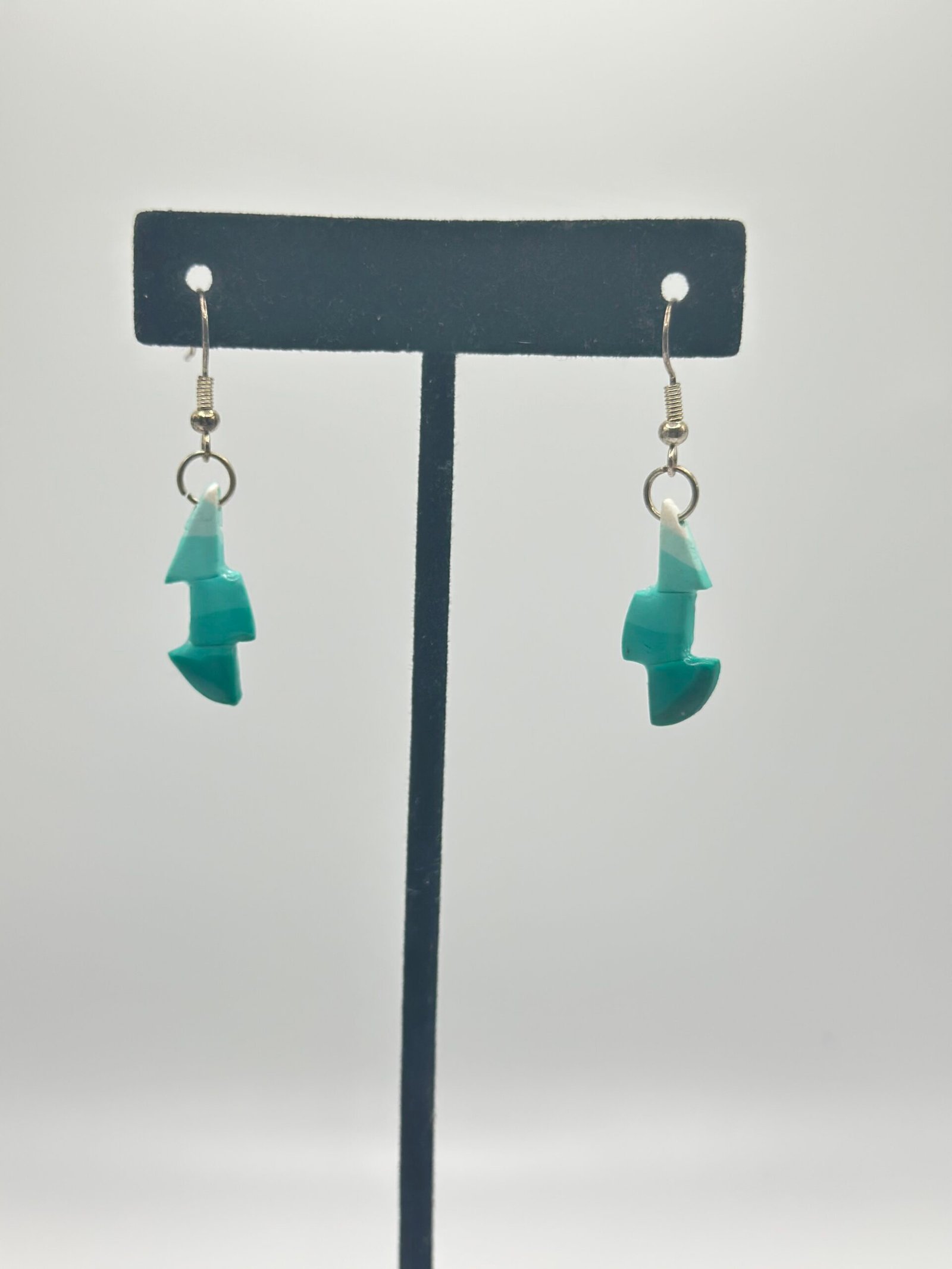 Small, dilution-striped glossed Aquamarine earrings in a shape I call ‘Tea’s offset.’ This staggered half-tear was an experimental shape originally suggested by a good friend called Tea.