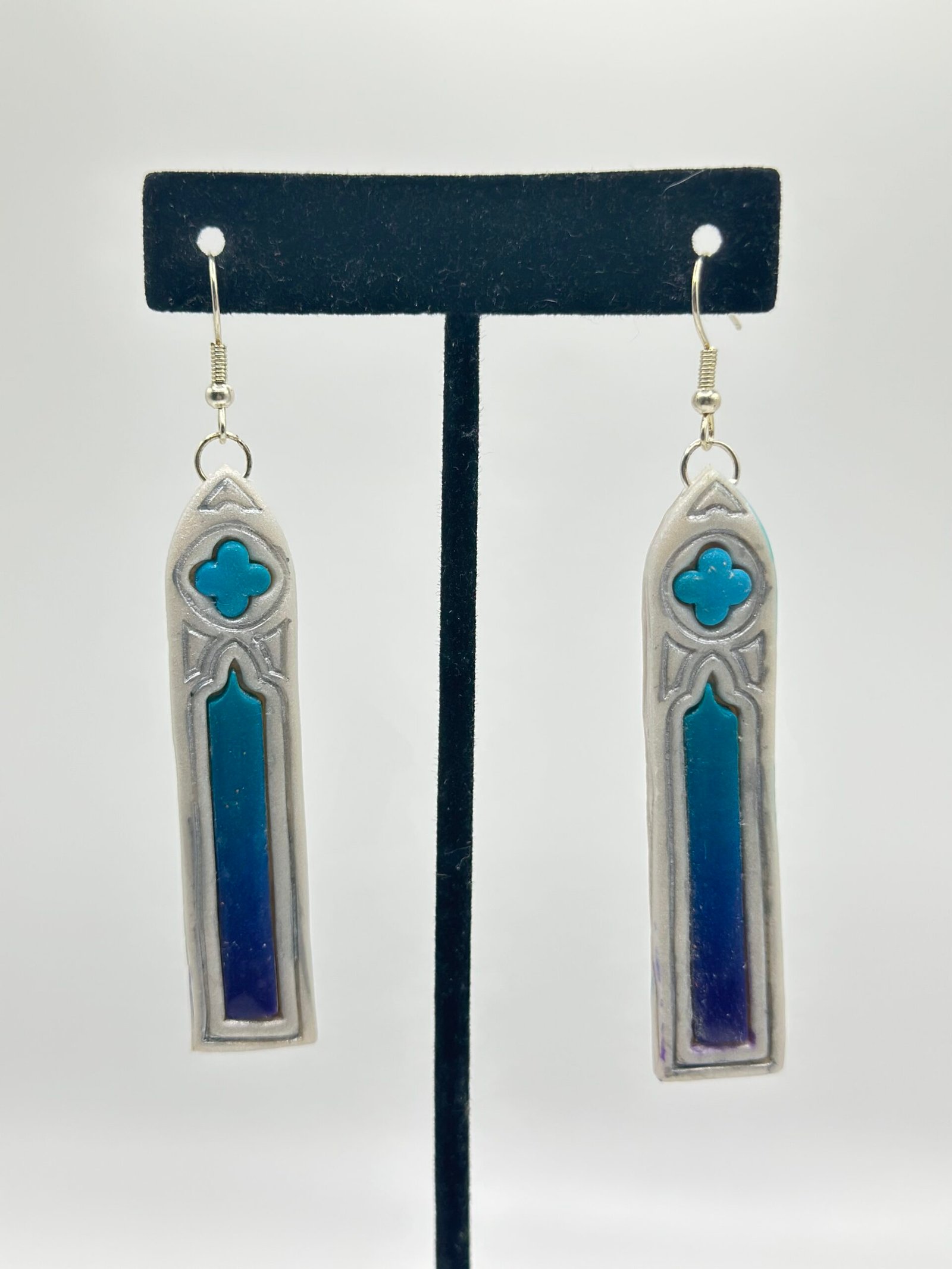 Tall, pale silver gothic windows surrounding a deep blue to violet gradient.